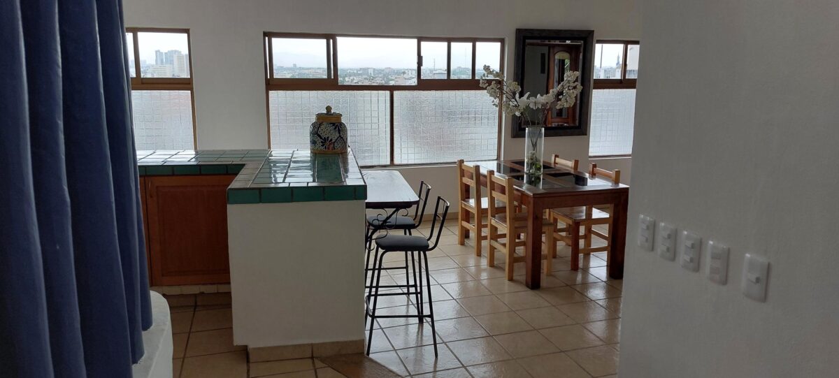 25,000 pesos a month with a year lease which includes gas, water, and internet. You pay Electricity usage, and cable if you choose to have it. It’s just had a big refresh and all maintenance was attended to. As well as a new AC in the main bedroom. It sits on the four floor which makes it the Penthouse. Only stairs to get up to it.