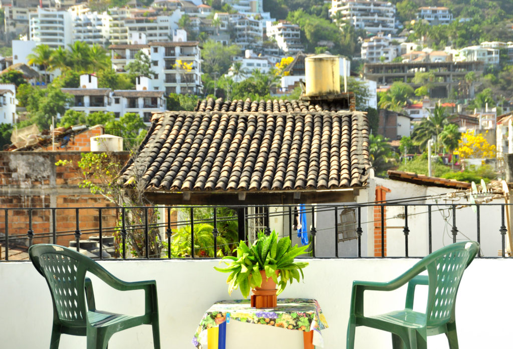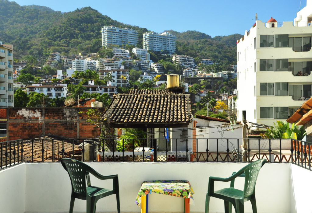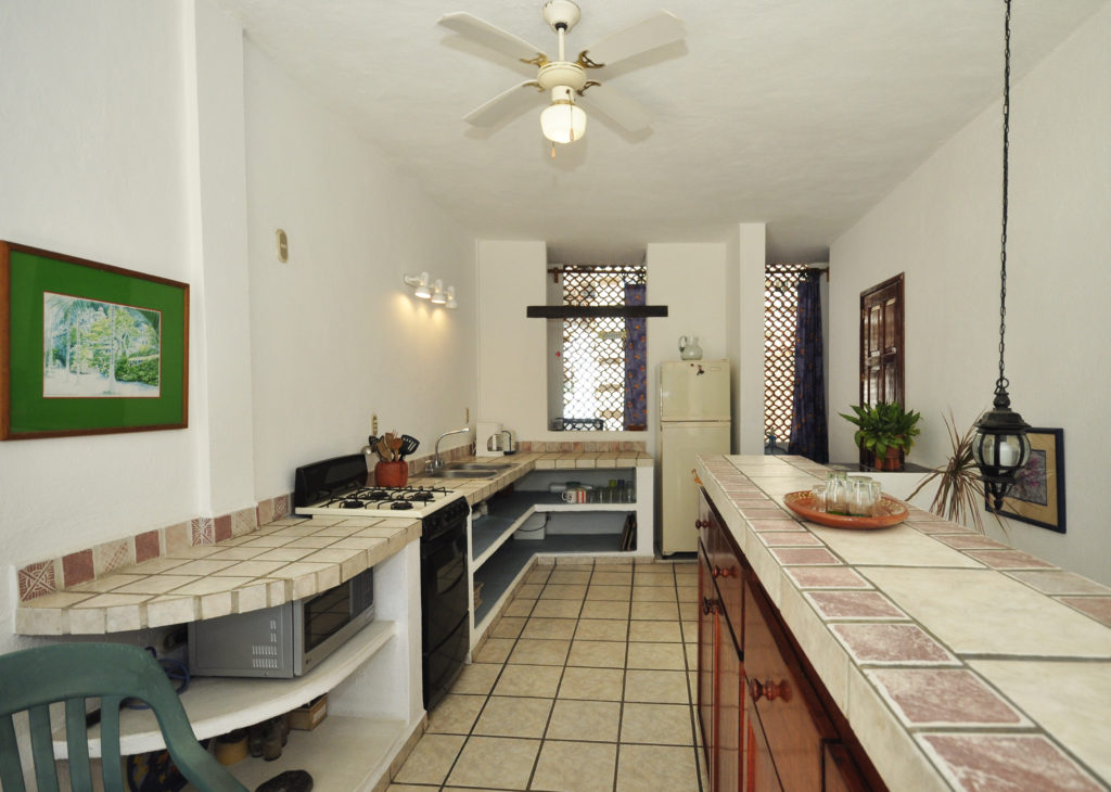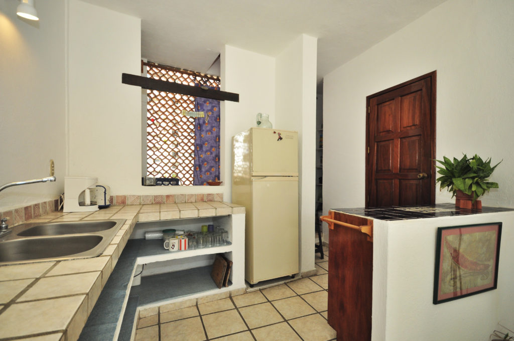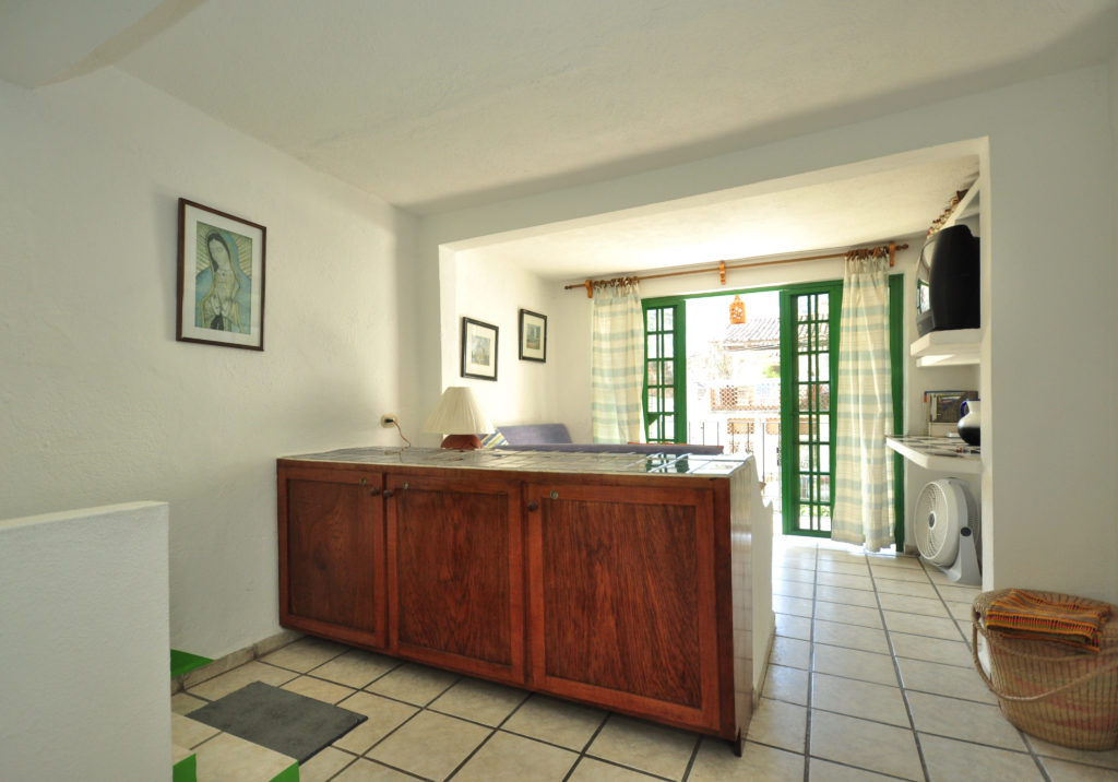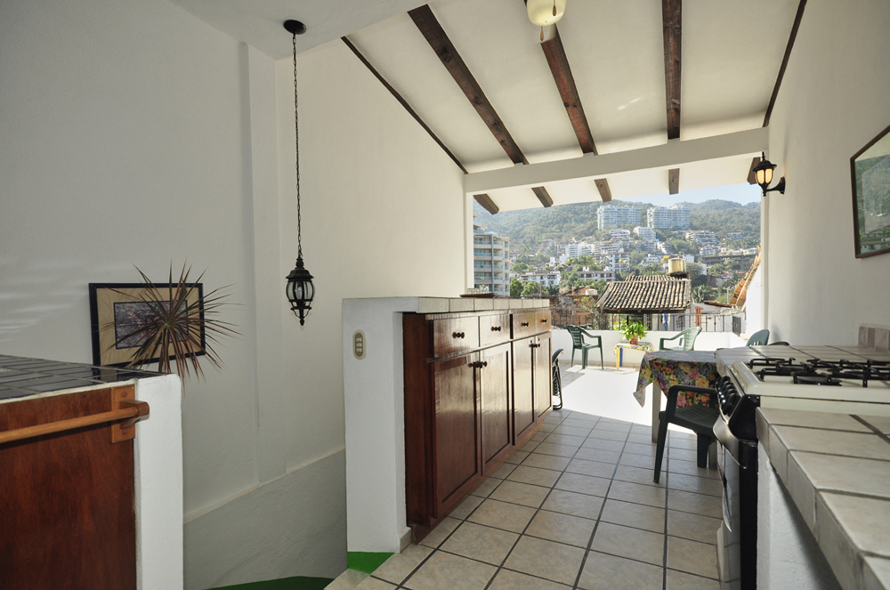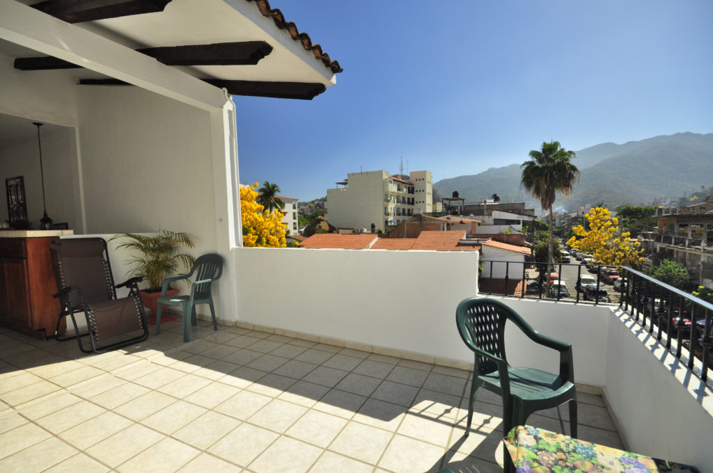 Up to a short flight of stairs, you will find your kitchen area and wonderful views from the open terrace penthouse top floor. Relax sitting in the sun or looking at the mountain and sea views as you enjoy your vacation stay in Puerto Vallarta. The terrace is a perfect place to have your morning coffee and breakfast from your fully equipped kitchen. The kitchen area includes a refrigerator, cooking and eating utensils, microwave, coffee maker, and stovetop and oven. There is an additional half-bath off of the kitchen area.