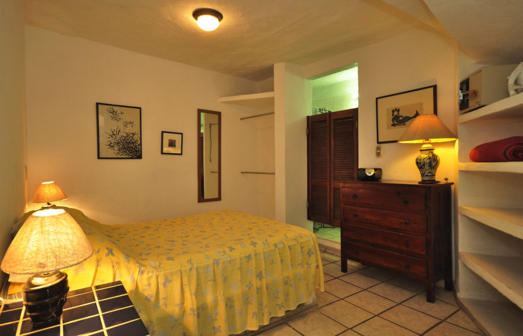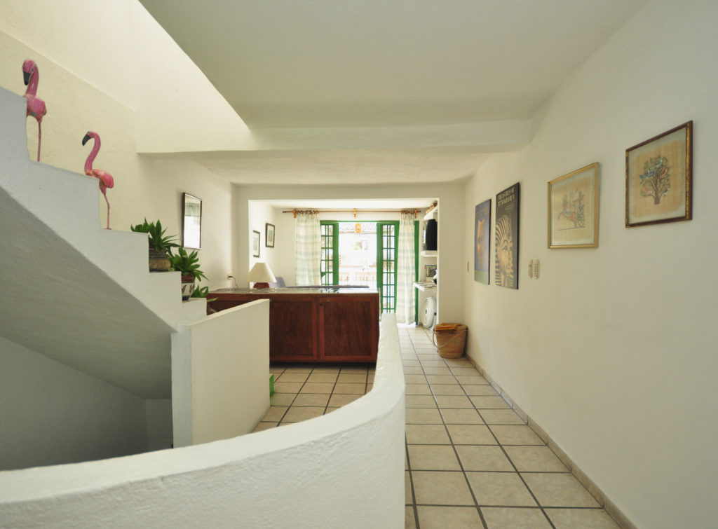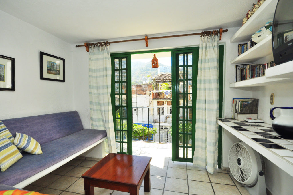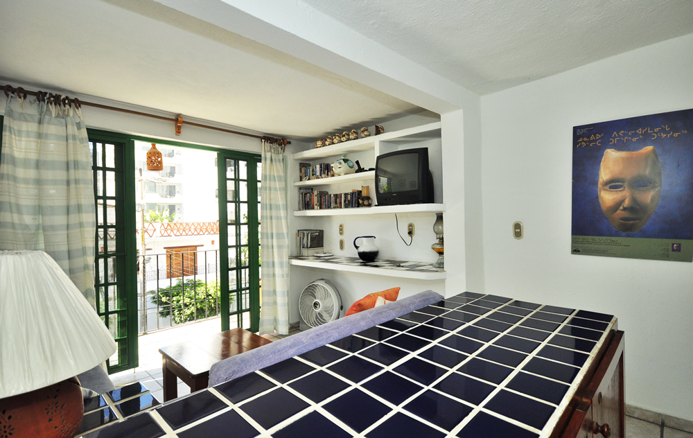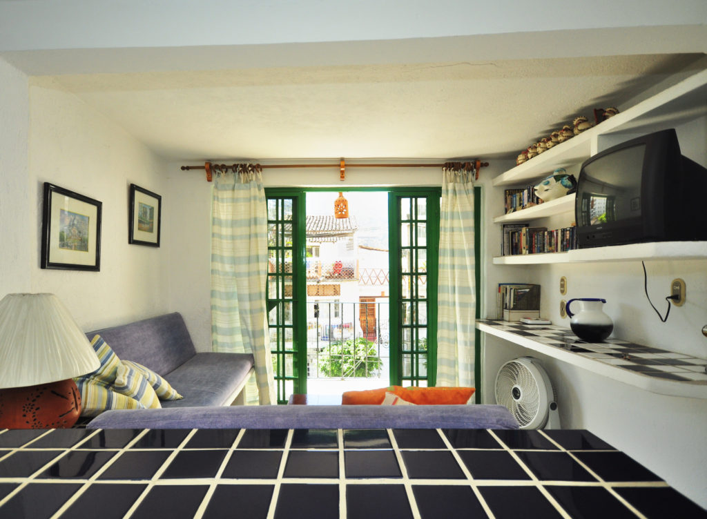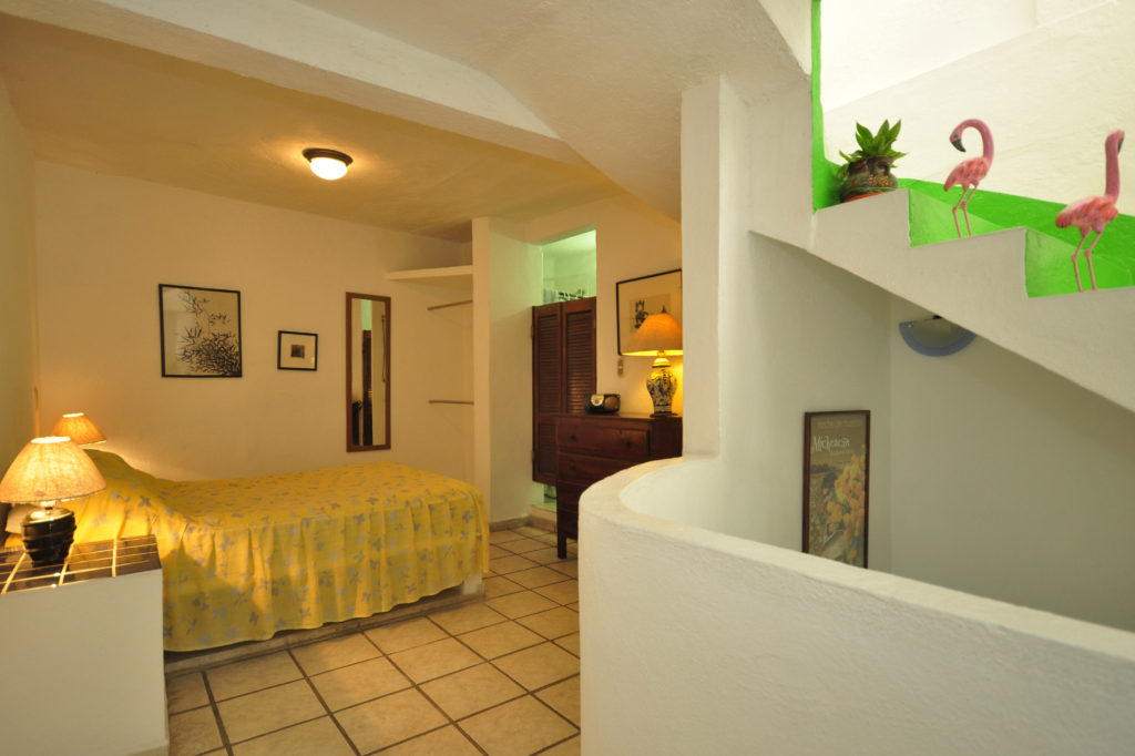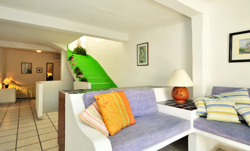 Up to a short flight of stairs, you will find your kitchen area and wonderful views from the open terrace penthouse top floor. Relax sitting in the sun or looking at the mountain and sea views as you enjoy your vacation stay in Puerto Vallarta. The terrace is a perfect place to have your morning coffee and breakfast from your fully equipped kitchen. The kitchen area includes a refrigerator, cooking and eating utensils, microwave, coffee maker, and stovetop and oven. There is an additional half-bath off of the kitchen area.