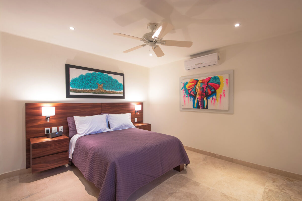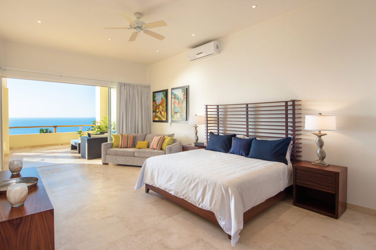 Bedroom 1 (Penthouse Bedroom – Entry Level): King-size bed, En-suite bathroom, A/C, Security Safe, Ocean view