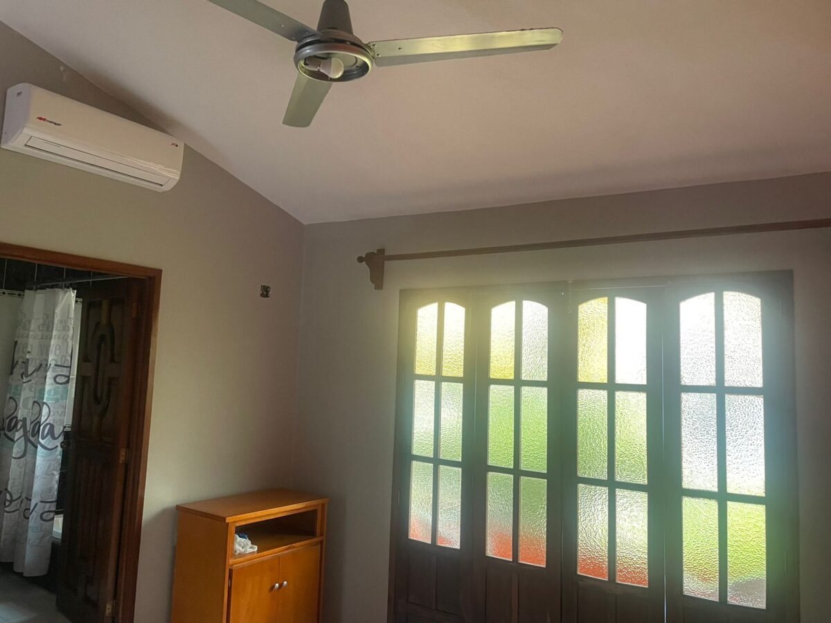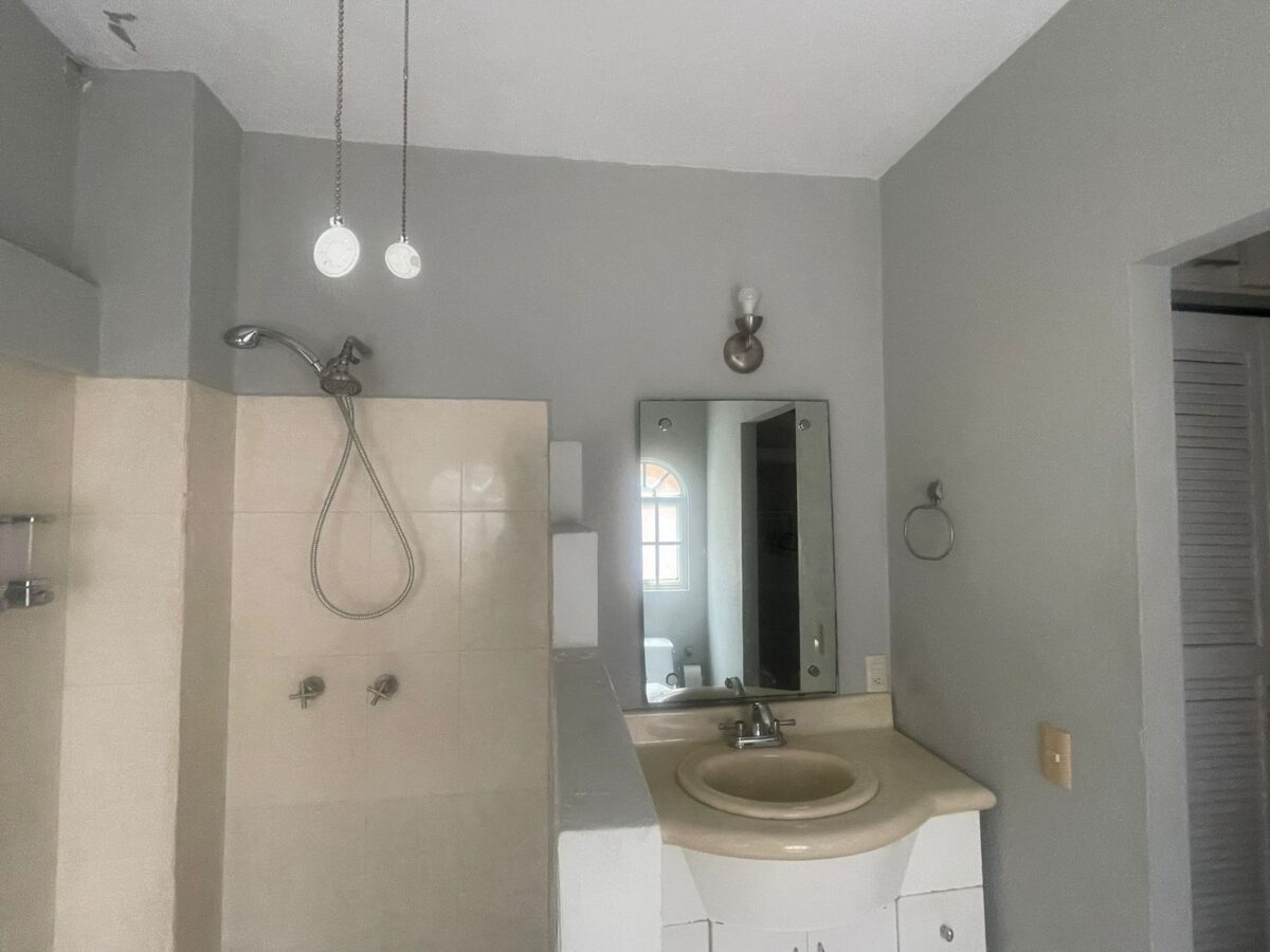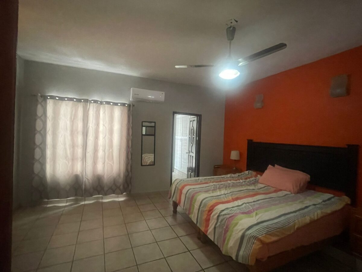 2 bedrooms with 2 bathrooms with AC in each bedroom and fans. Balcony in the main bedroom, with a bathtub in the main bathroom.
