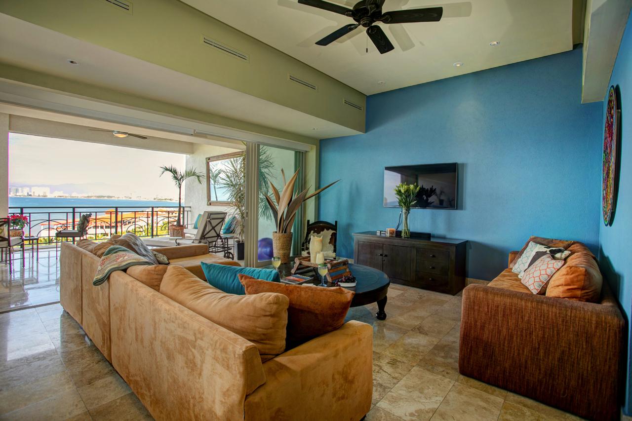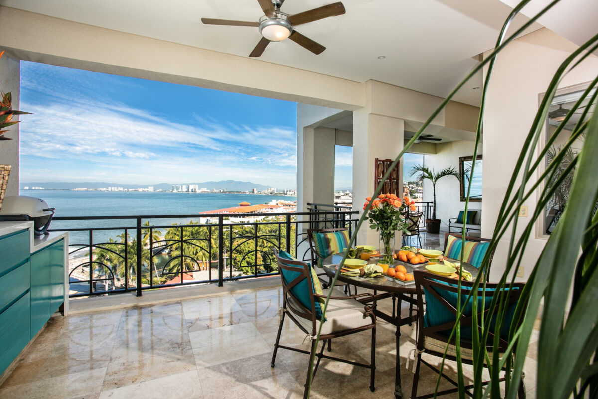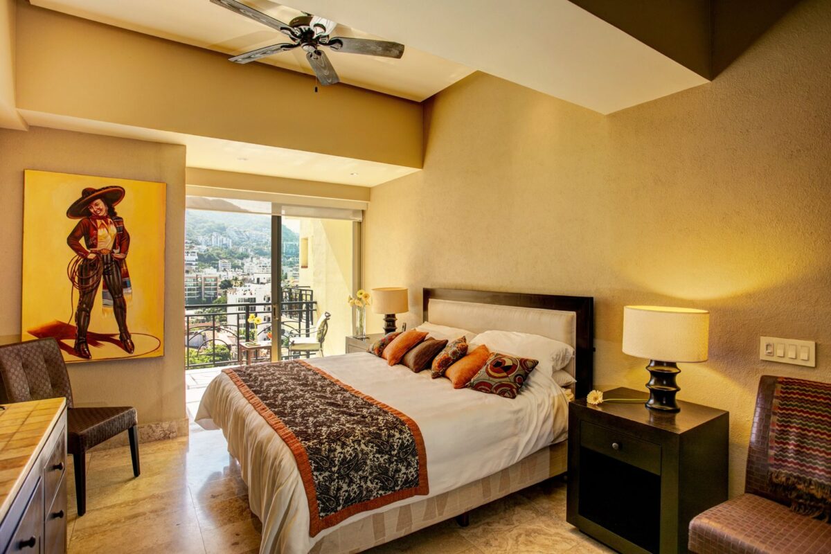 This Puerto Vallarta condo rental is 3000+ sq ft of luxury! It has 2 master bedrooms with king beds, spacious en-suites, and patios to greet the morning sun and mountain views. A third bedroom/den has a queen bed and a bathroom beside it. A small hotel safe is on site. (Nonsmoking, please.)