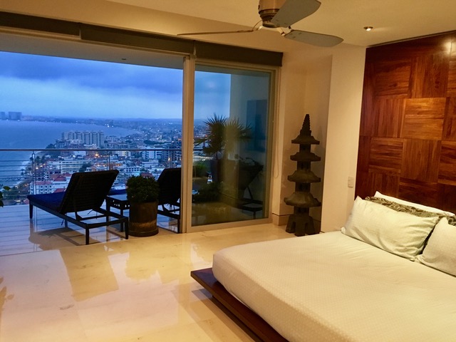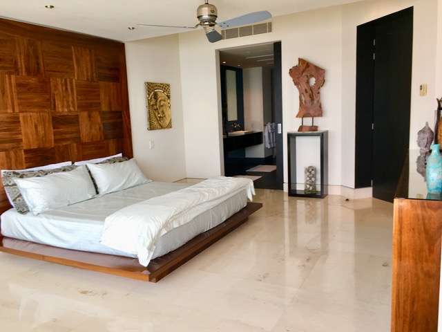 This upscale Puerto Vallarta rental condo offers spacious areas finely designed and decorated, including modern custom-designed furniture, and marble floors in all rooms that highlight the zen-like modern feel of the space. The main bedroom suite has a King-size bed, private bathroom with shower and tub, walk-in closet, ceiling fan, air conditioning, safe, 42” flat-screen TV with satellite programming, and patio doors that lead out onto the balcony.