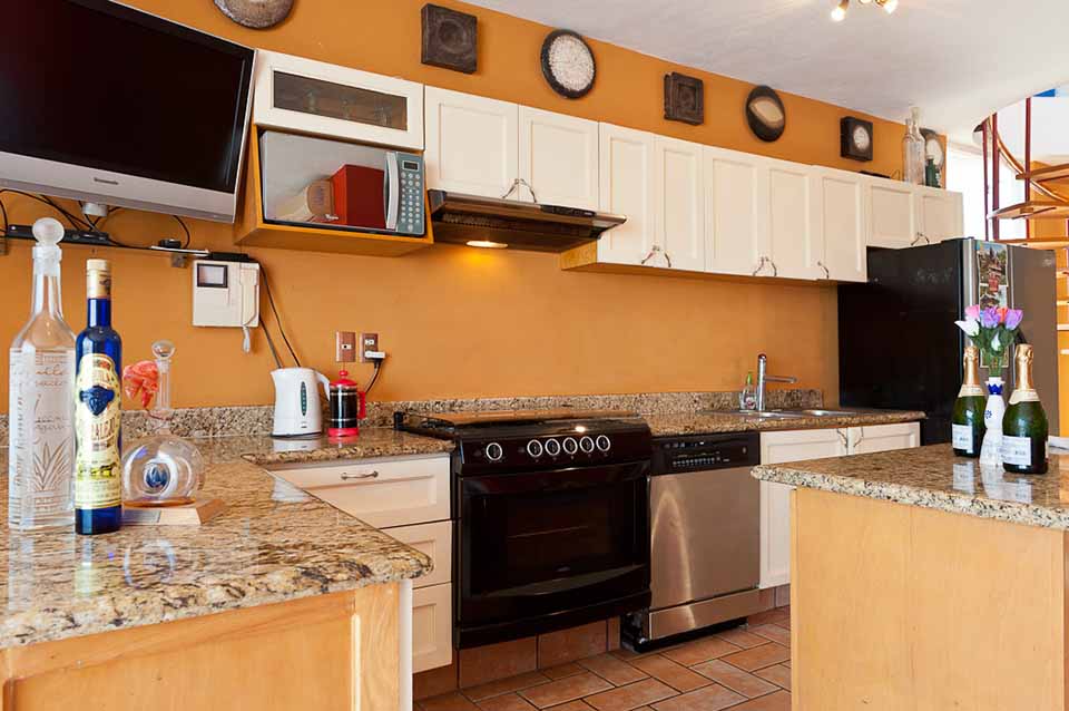 Full kitchen with gas oven, microwave, dishwasher, washer & dryer, toaster, juicer, coffee maker, crockpot, and granite countertops