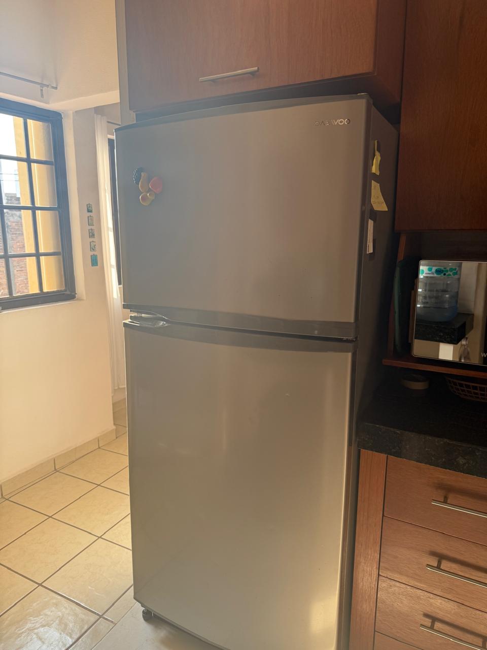 The kitchen has a new refrigerator, a new stove, and a microwave.