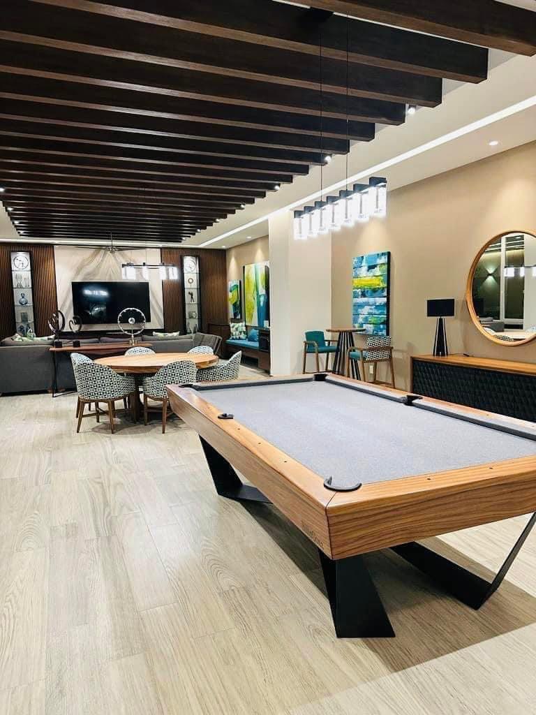 The common areas at V Golf include a saltwater pool, a game room, a restaurant, a roof garden with Jacuzzi and hammocks, barbecue grills, and a professional