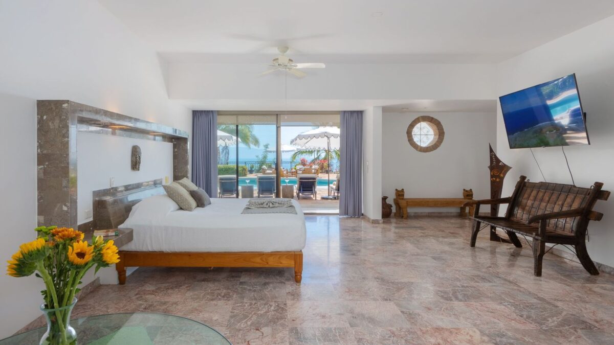 Main Level: Two spacious primary bedrooms with king-size beds, en-suite bathrooms, and direct access to the pool terrace.