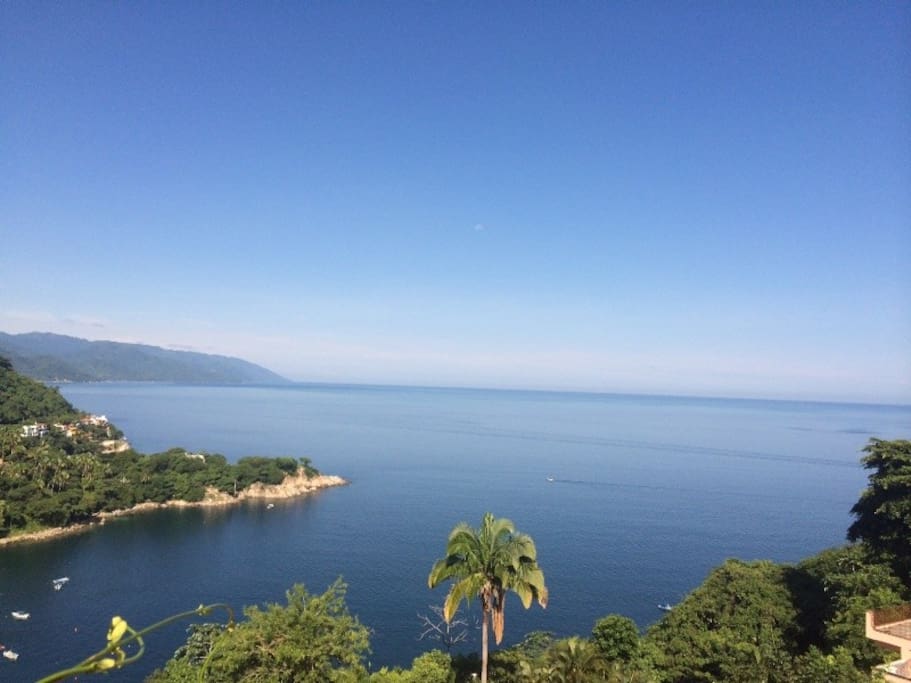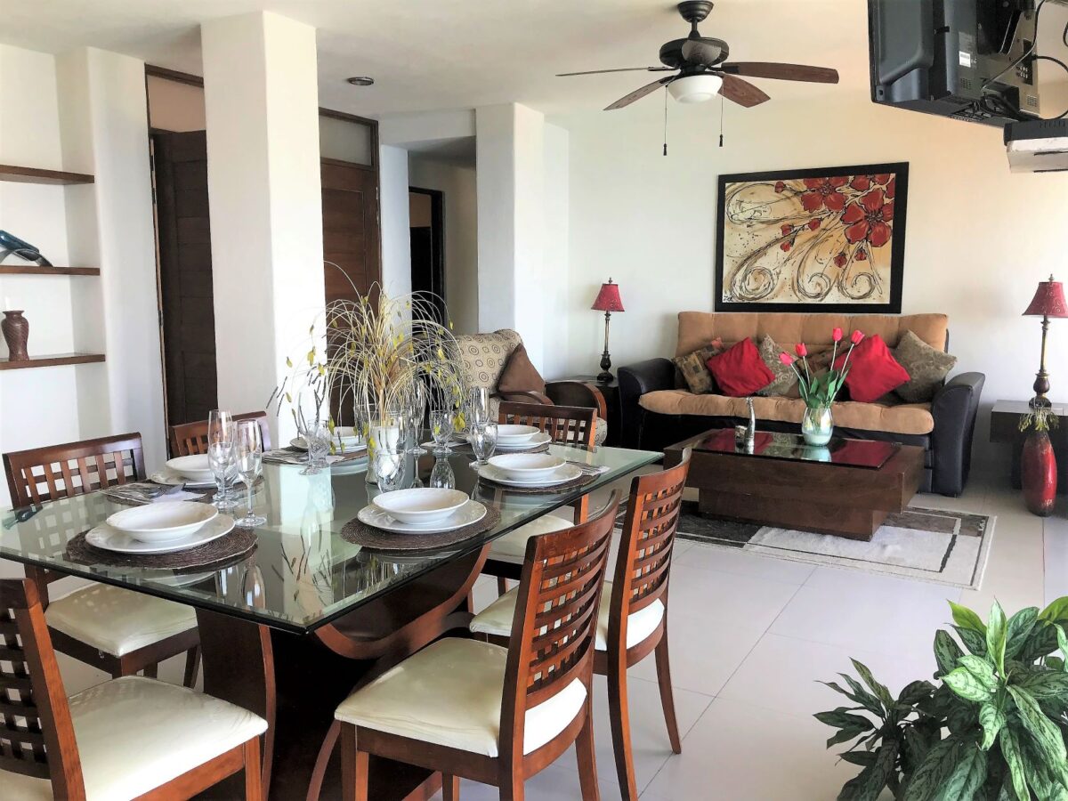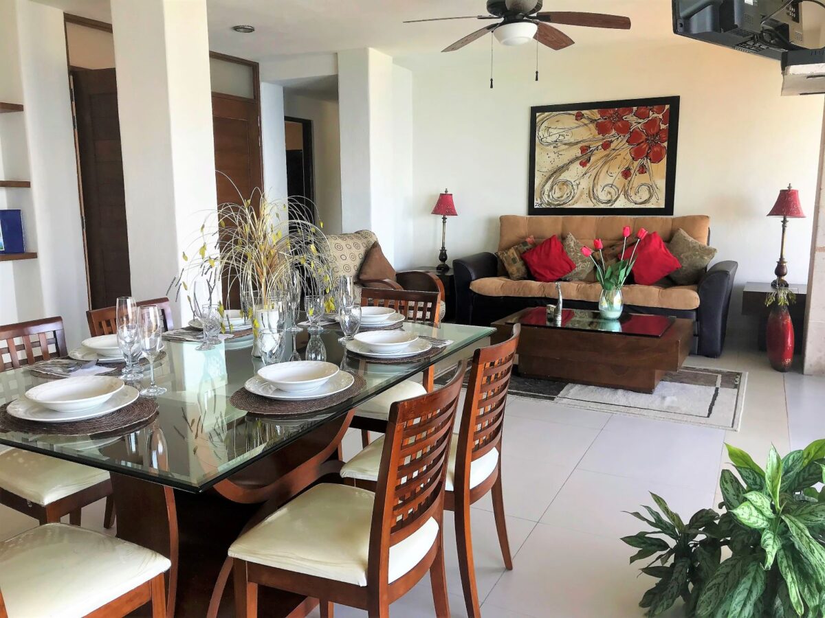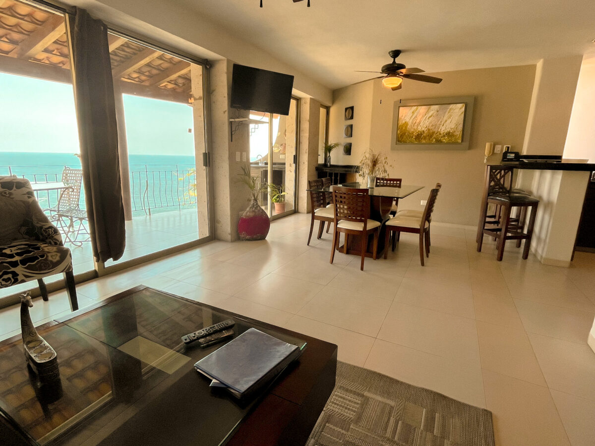 Living room with sofa bed, Smart TV, dining room, fully equipped kitchen, terrace overlooking Mismaloya Bay and beach.